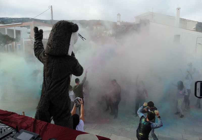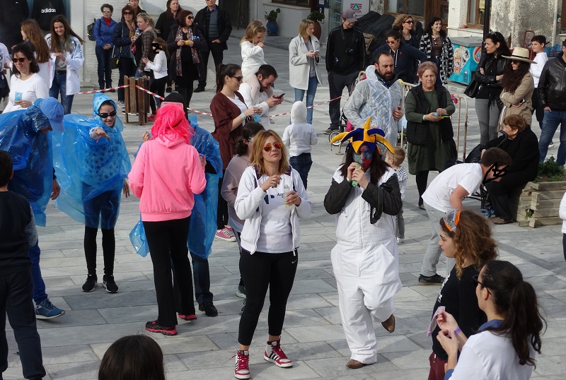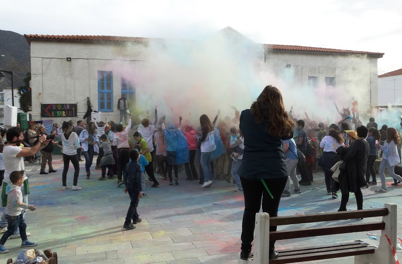 Και ο μαέστρος-μασκώτ έδωσε το σύνθημα κι έγινε ένα πολύχρωμο σύννεφο σκόνης όλη η πλατεία. Χάθηκαν οι μετέχοντες και συμμετέχοντες κάτω από αυτό. Κοντέψαμε να χαθούμε κι εμείς αν και είμαστε παράμερα. Πάντως ελαφρώς σύχρηστοι γίναμε! Σκουπίζαμε ρούχα, φωτογραφικές μηχανές κλπ (φωτ. Εν Άνδρω).