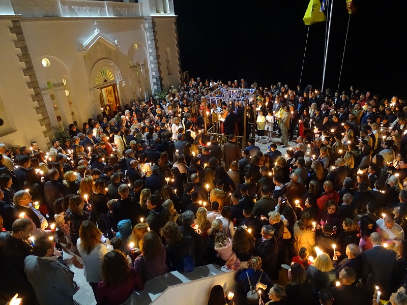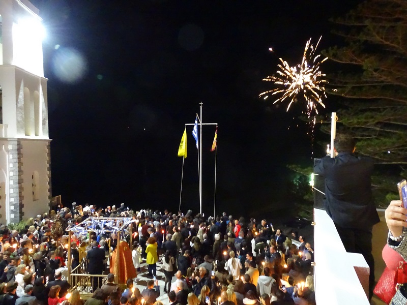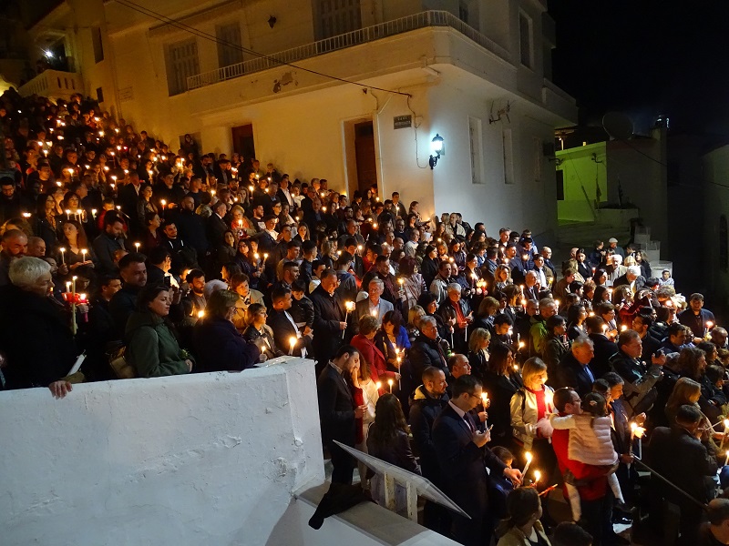 Μέγα πλήθος συνέρρευσε στην εκκλησία και στο προαύλιο και όταν ο παπα - Μιχάλης είπε το "Δεύτε λάβετε φως εκ του ανεσπέρου φωτός" και άναψαν όλα τα κεριά η εικόνα ήταν μοναδική (φωτ. Εν Άνδρω).