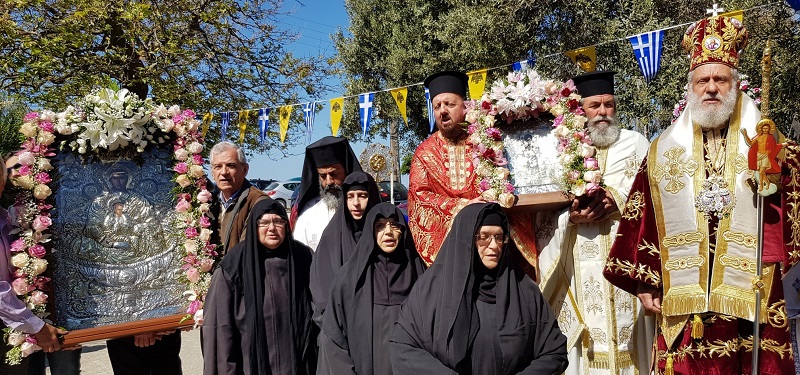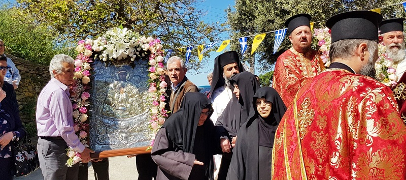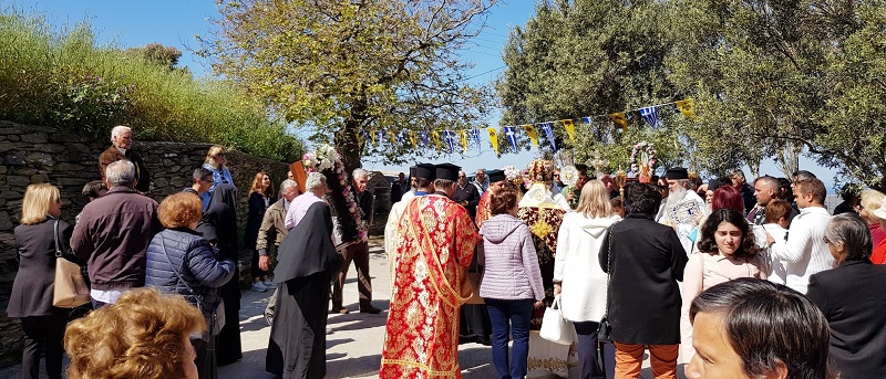 Στην γιορτή παραβρέθηκε και χοροστάτησε ο μητροπολίτης Άνδρου - Σύρου. Στην φωτογραφία η ηγουμένη Παρθενία και ο μητροπολίτης με τους ιερείς, τις μοναχές με την μεγαλοπρεπή εικόνα της Παναγίας στο προαύλιο του μοναστηριού...