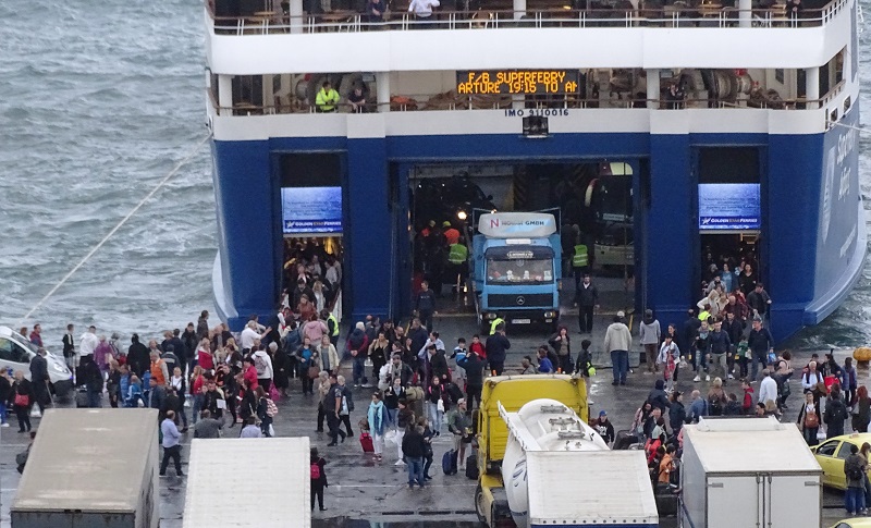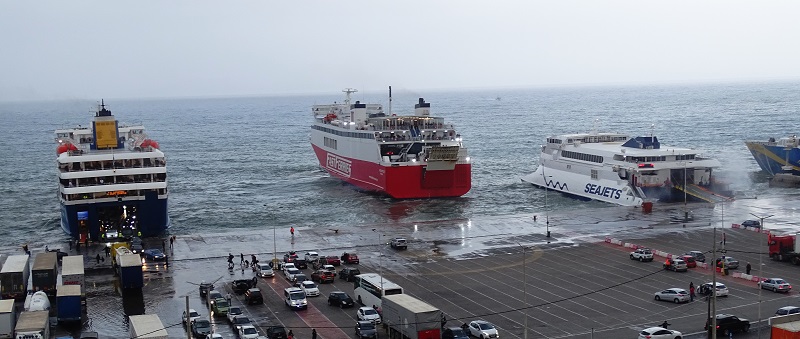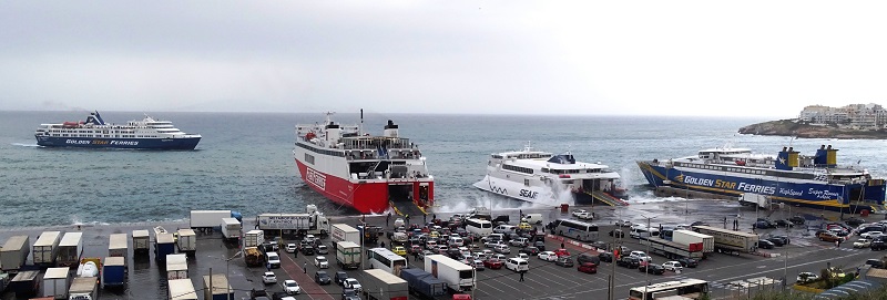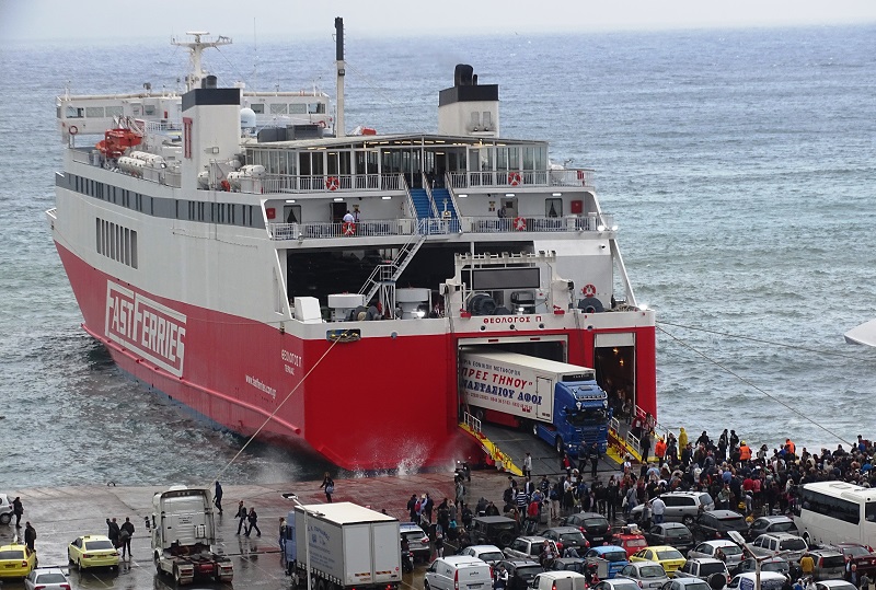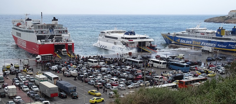 Ξεφόρτωσε, φόρτωσε, μέσα σε 3/4 ο Θεολόγος και φεύγει για Άνδρο - Τήνο - Μύκονο. Δίπλα το Superferry ακόμα ξεφορτώνει ΙΧ. (φωτ. Εν Άνδρω).