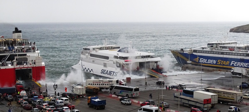 Ραφήνα. ένα λιμάνι ορθάνοιχτο στο Νοτιά. Περίεργος ο κυματισμός του Νοτιά. Δεν φαίνεται όμως το κύμα του είναι βουβό. Δεν το βλέπεις στο πέλαγος να αφρίζει. Όμως έρχεται βουβό και σκάει πάνω στην προβλήτα που στέκει αντίκρυ του και την καβαλάει. Άντε να βγεις ή να μπεις στο καράβι και να μην βραχείς. Εδώ τα κύματα έχουν περικυκλώσει το μικρό ταχύπλοο της Seajets λες και θέλουν να το πνίξουν... (φωτ. Εν Άνδρω).
