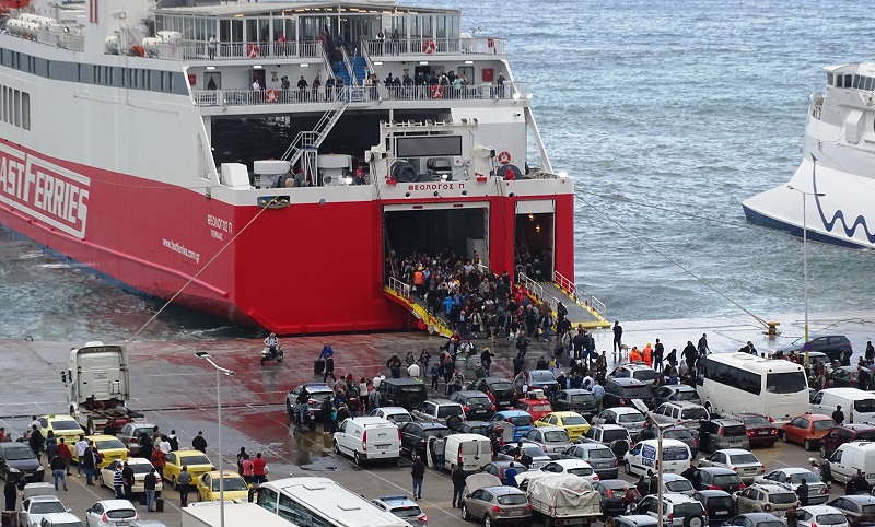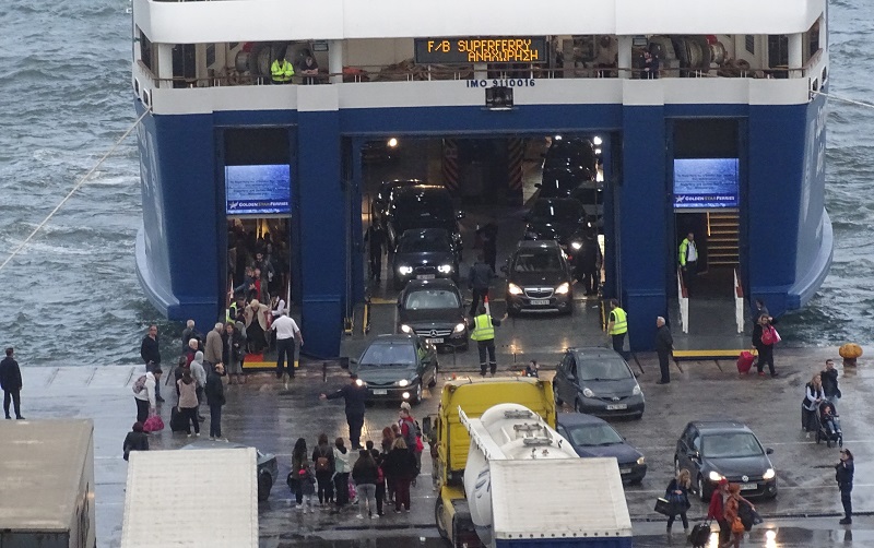 Εκατοντάδες ΙΧ και δεκάδες νταλίκες έφερε από τα τρία νησιά και αρκετά παίρνει πάλι μαζί του για το βραδινό ταξίδι του. Επιστρέφουν μαθητές, καθηγητές, εργαζόμενοι στις βάσεις τους. Έμειναν μακριά από αυτές μέχρι την τελευταία στιγμή... (φωτ. Εν Άνδρω).