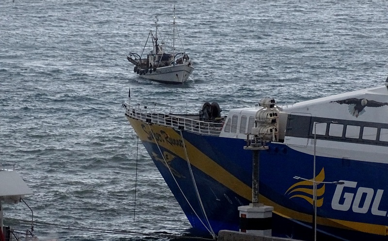 Κάποια στιγμή φάνηκε κι ένα αλιευτικό να έρχεται στο λιμάνι με την μπάντα. Ο κυματισμός βλέπεις. Διακρίνεται πίσω από το Superrunner που είναι διπλοδεμένο... (φωτ. Εν Άνδρω).