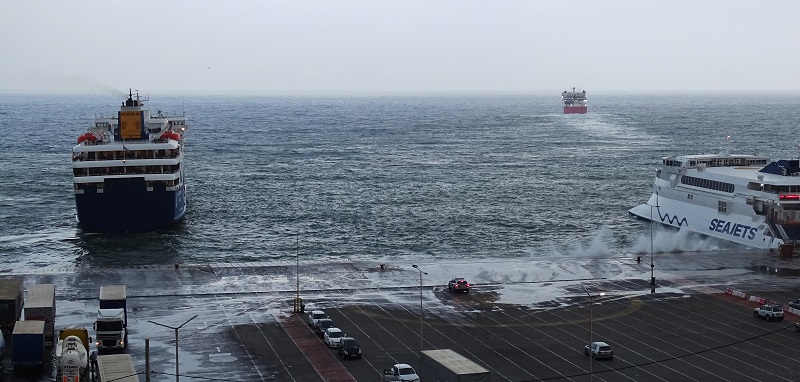 Δένει με απόλυτη ακρίβεια και μεγάλη προσοχή. Εντυπωσιακοί καπετάνιοι και οι δύο (και ο Σκιαδάς του Θεολόγος και ο Χαλάς του Superferry) παρά την κρυφό κυματισμό του Νοτιά που σπρώχνει τα πλοία στην προβλήτα αυτοί τα φέρνουν στα δύο μέτρα και δένουν λες και κουμαντάρουν βάρκες (φωτ. Εν Άνδρω).
