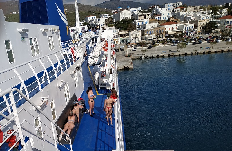 Οι κυρίες από Ταϊβάν. Ταξιδεύουν με το Superferry. Ταξιδεύουμε μαζί και μας χαιρετάνε. Καλοκαιρινή στιγμή από αυτές που χαρακτηρίζουν το μεγάλο ελληνικό αιγαιοπελαγίτικο καλοκαίρι... (φωτ. Εν Άνδρω).