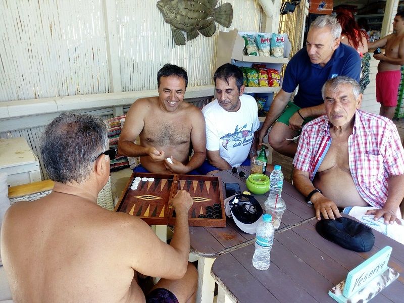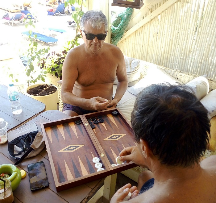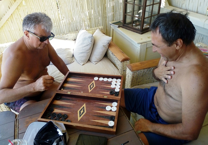 Έτσι σε μια σκιερή και δροσερή γωνιά του beach bar έστησαν το τάβλι και παραδίδουν μαθήματα στις «πόρτες» το «πλακωτό» το «φεύγα» και το «βίδο»!