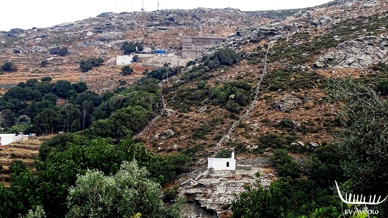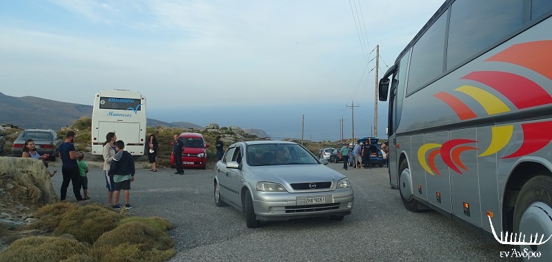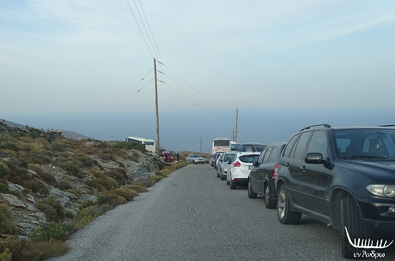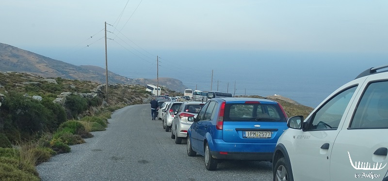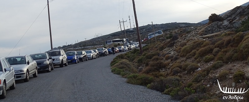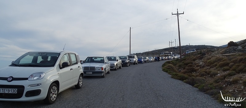 Ανηφορίζοντας για τις Εβρουσιές είχες μια πανοραμική θέα των αυτοκινήτων, αλλά όχι του κόσμου, που είχε ήδη σπεύσει στο μοναστήρι δημιουργώντας το αδιαχώρητο. Το αδιαχώρητο και στο στενότερο σχετικά δρόμο προς Αγία Μαρίνα από την διασταύρωση προς το μοναστήρι. Μεγάλο το πλήθος που έφτασε από κάθε γωνιά της Άνδρου στη γιορτή του μοναστηριού.