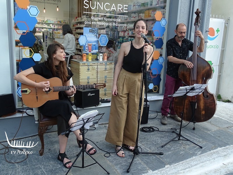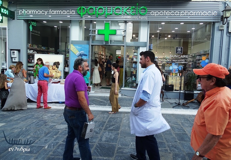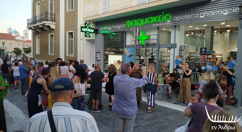 Και ξαφνικά γέμισε κόσμο η γειτονιά. Στο πάνω μέρος του πεζόδρομου στη Χώρα είχε εγκαίνια το ανακαινισμένο και ανανεωμένο - στη νέα του θέση - φαρμακείο. Βγήκαν τραπέζια στο δρόμο. Ήρθε κόσμος. Και άρχισε και μια εξαιρετική συναυλία τζαζ από ένα εξαιρετικό τρίο!!! Κάτι από χρώμα Νέας Ορλεάνης στην Άνδρο!...