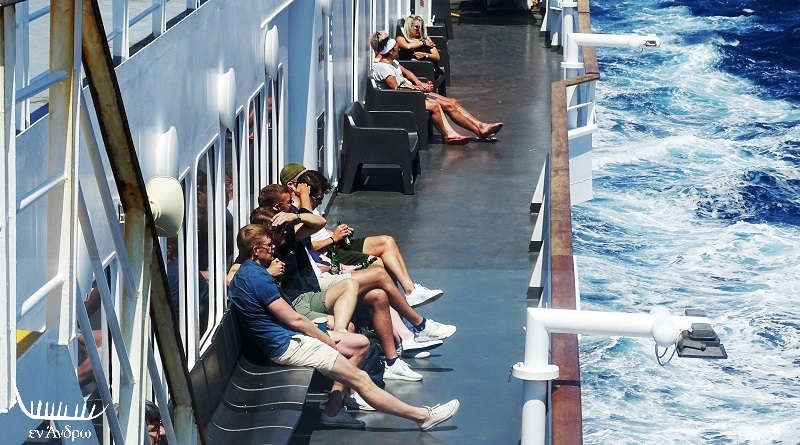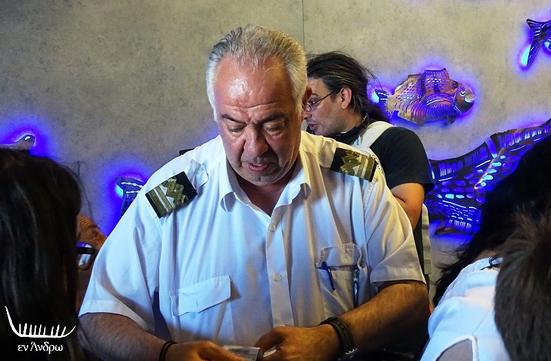 Στην Άνδρο ο Σπύρος, ο αρχιλογιστής του καραβιού δεν προλαβαίνει - αργά το απόγευμα - να κόβει εισιτήρια. Πλήθος οι επιβαίνοντες για Ραφήνα...