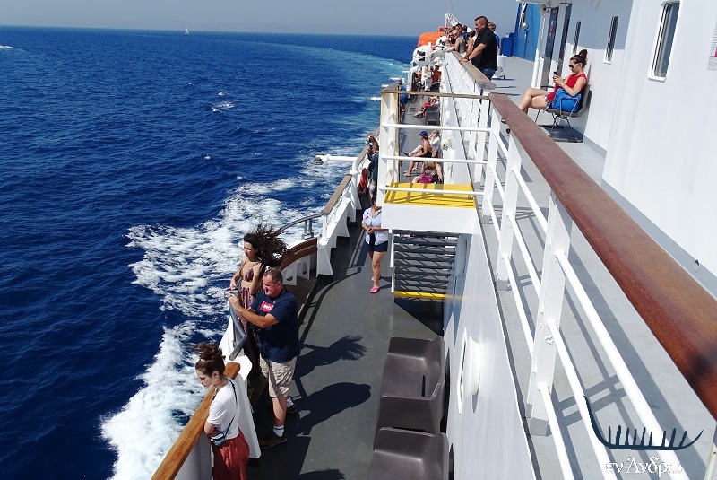 Δύο όμορφες κοπέλες απολαμβάνουν τη διαδρομή για Σαντορίνη.