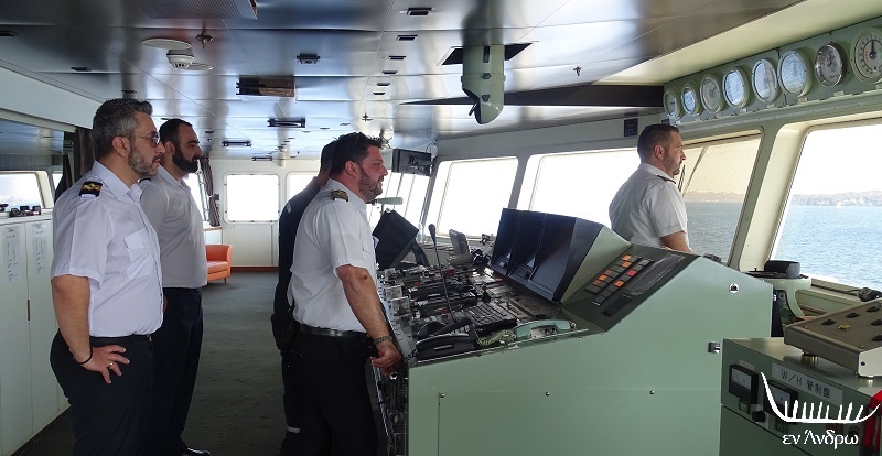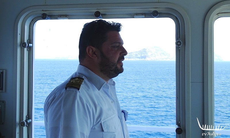 Οι αξιωματικοί του πλοίου στην γέφυρα, καθώς το Superferry πλησιάζει στο Αθηνιό, το μισοβουλιαγμένο λιμάνι του νησιού. Μάλιστα, η παγκόσμια Σαντορίνη έχει μείνει κι αυτή με μιάμιση θέση πλοίου!!!