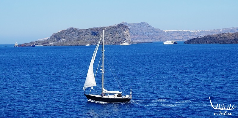 Το μικρό ιστιοφόρο ταξιδεύει νότια με φόντο την Καμένη, την Θηρασιά και την Οία...