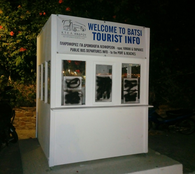 Κακοήθεια που στρέφεται εναντίον της τουριστικής υπόστασης της Άνδρου, σημειώθηκε στο Μπατσί. Άγνωστοι βανδάλισαν το τουριστικό περίπτερο παροχής πληροφοριών που βρίσκεται στο κέντρο της παραλίας!