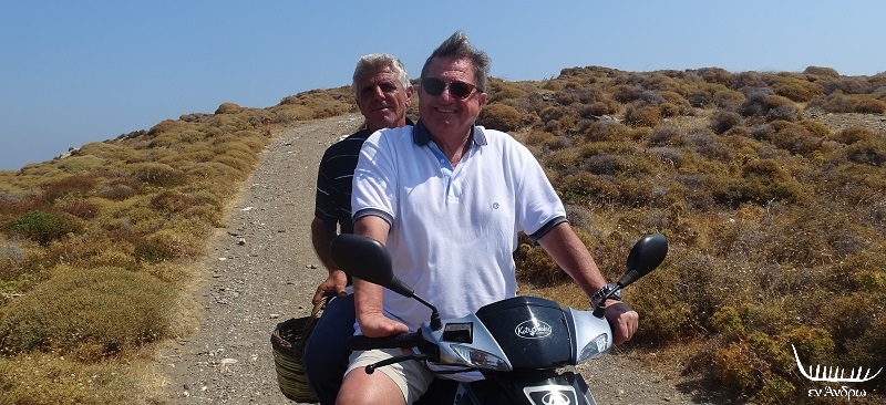 Φτάνοντας στην Αγία Τριάδα είδαμε άλλους δύο ανθρώπους δίπλα στο εξωκλήσι να χαιρετάνε από ψηλά το πλοίο. Αφού φωτογραφισαμε και βιντεοσκοπήσαμε το πλοίο στη βάση του μικρού λόφου αρχίσαμε να ανεβαίνουμε στο εξωκλήσι για να πάρουμε και την στροφή του. Και τότε είδαμε έναν χαμογελαστό Δημητρη Στεφάνου πάνω σε ένα μηχανάκι με έναν φίλο του να κατεβαίνει! Αυτοί ήταν οι άλλοι δύο που χαιρετούσαν. Μας είπε συγκινημένος: "Κάθε φορά που περνά πλοίο και σφυρίζει από την Άνδρο βγαίνω στην Αγία Τριάδα και το χαιρετώ. Δεν έχει σημασία ποιου είναι. Είναι τα ανδριώτικα πλοία κρατάνε την παράδοση και χαιρετάνε το νησί μας"...