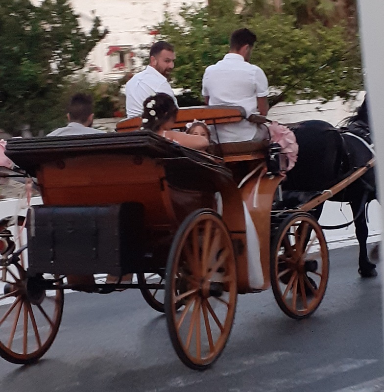 Γιατί είναι πρωτότυπος ο τρόπος αυτός μιας και είναι η πέμπτη φορά που ο Γιώργος Ζαγοραίος με την άμαξα του και το άλογο του καλείται να δημιουργήσει το σκηνικό ενός εντυπωσιακού και ρομαντικού γάμου. Είναι μόλις ο δεύτερος γάμος που γίνεται στη Χώρα με άμαξα. Ο πρώτος ήταν πριν καιρό όταν η άμαξα πήρε τη νύφη από τα Λειβάδια και την πήγε στο εξωκλήσι κοντά στο ελικοδρόμιο. Και μετά την έφερε πίσω κι έκαναν και μια βόλτα στην Χώρα.