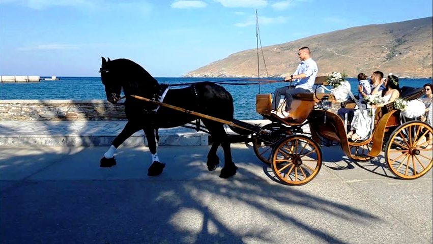 Και οι άλλοι τρεις γάμοι έγιναν στο Κόρθι όπου η άμαξα πήρε τη νύφη από τον Όρμο και την πήγε στην εκκλησία της Αγίας Αικατερίνης για την γαμήλια τελετή. Ο Γιώργος Ζαγοραίος σκέφτηκε εδώ και ενάμιση χρόνο να αξιοποιήσει το χόμπι της οικογένειας για τα άλογα (έχουν μερικά εξαιρετικά στην φάρμα τους και τα έχουμε παρουσιάσει) μαζί με δύο παλιές άμαξες που συντήρησε. Με τον τρόπο αυτό δημιουργεί μια ρομαντική και πρωτότυπη ατμόσφαιρα για γάμους που γίνονται στην Άνδρο. Οι μνήμες ζωής (όπως είναι ένας γάμος) για να είναι όμορφες και να ξεχωρίζουν θέλουν κι αυτές το σκηνικό τους, αλλά και κάτι εξαιρετικό για να ξεχωρίσουν ανάμεσα από την καθημερινότητα. Μια άμαξα με ένα υπέροχο άλογο που φέρνει τη νύφη στην εκκλησία μέσα από το μοναδικό σκηνικό της Χώρας που παραπέμπει στις αρχές του 20ου αιώνα ή στην παραλία του Κορθίου που σε ταξιδεύει σε άλλες εποχές σίγουρα κάνουν την διαφορά...