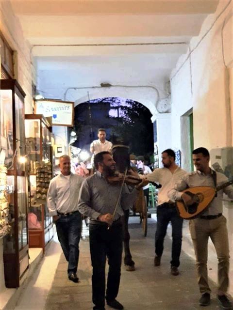 Στην Καμάρα προστέθηκαν και βιολιά και λαούτα που έπαιξαν το παραδοσιακό "Σήμερα γάμος γίνεται σε ωραίο περιβόλι..." και πλέον όλα ταίριαξαν σαν σε ταινία εποχής. Και όλοι μαζί συνέχισαν για τον Άγιο Γεώργιο όπου τελέστηκε ο γάμος του ζευγαριού που και οι δύο ήταν από την Χώρα. Όπως είπαν ο γαμπρός ήθελε να κάνει δώρο στη αγαπημένη του μια τόσο εντυπωσιακή και ρομαντική προσέλευση στην εκκλησία. Για να την θυμάται. Και μαζί με αυτή να την θυμόμαστε και όλοι όσοι φωτογράφιζαν το πρωτότυπο τους γεγονότος.