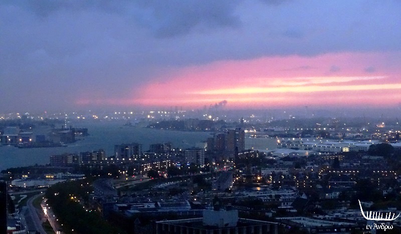 Άποψη από το απέραντο ποταμολίμανο του Ρότερνταμ στο σούρουπο.