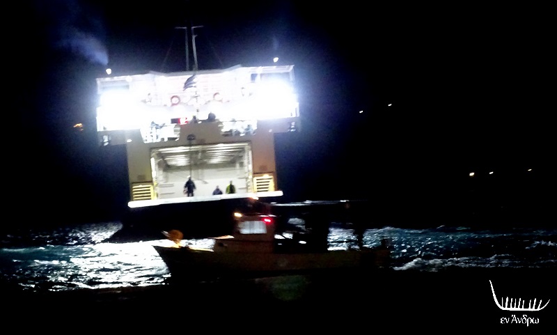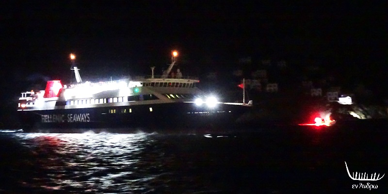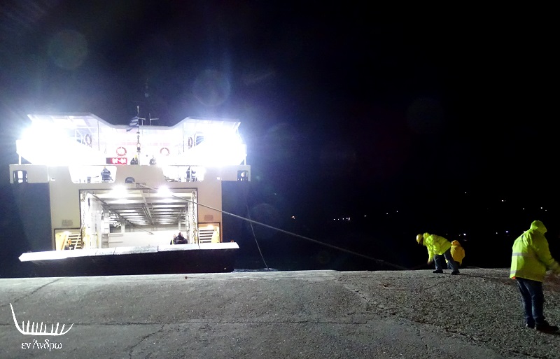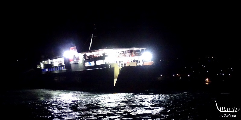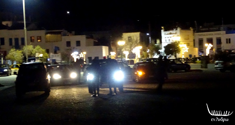 Σε ένα άδειο και καλοφωτισμένο Γαύριο μαζεύτηκαν ξαφνικά γύρω στις 22:00 καμιά 10αριά αυτοκίνητα στη νότια προβλήτα, με πολύ περισσότερους επιβαίνοντες, από όλη την Άνδρο και κυρίως από το Γαύριο, που περίμεναν το πλοίο και μόλις το είδαν άρχισαν όλα μαζί να κορνάρουν χαρούμενα.