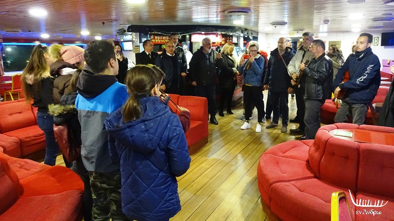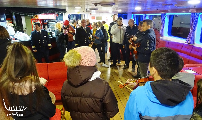 Στο πλοίο ανέβηκαν να καλωσορίσουν, να ευχηθούν και να πουν τα κάλαντα στον καπετάνιο και στο πλήρωμα μια ομάδα μαθητών που συνόδεψε ο δημοτικός σύμβουλος Α. Αντώνογλου, δύο λαϊκοί οργανοπαίκτες, ο πρόεδρος του Τοπικού του Γαυρίου Ν. Χέλμης και ο αντιδήμαρχος Δ. Τηνιακός. Επίσης από τις υπηρεσίες παρών πρώτο-πρώτο το λιμεναρχείο με τον αξιωματικό Δ. Μανιδάκη και η πυροσβεστική με τον υποδιοικητή Δ. Πρινιωτάκη. Επίσης ήταν εκεί η πράκτορας του πλοίου Άννα Στυλιανού με τον σύζυγό της Φραγκίσκο και αρκετοί κάτοικοι...