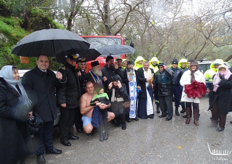 Με ομπρέλες και αδιάβροχα κατέβηκαν όλοι στην όχθη του ποταμού και αφού έψαλλαν το "εν Ιορδάνη" έριξαν τον ξύλινο σταυρό στα ορμητικά νερά. Και ο Παναγιώτης Νόνας με τον γιο του μπήκαν και έπιασαν τον σταυρό. Ο Παναγιώτης Νόνας βουτάει για τον σταυρό 22 χρόνια! Και πέρσι βούτηξε και στην Αγία Θαλασσινή και στα Λάμυρα! Κι εφέτος αποφάσισε να ξεκινήσει και ο γιος του για πρώτη φορά από τα Λάμυρα...