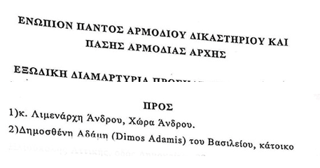 (3) ΣΤΟΙΧΕΙΑ ΑΠΟ ΤΟ ΕΞΩΔΙΚΟ ΚΑΤΑ ΔΗΜΟΣΘΕΝΗ ΑΔΑΜΗ του ΒΑΣΙΛΕΙΟΥ ΚΑΙ ΚΑΤΑ ΛΙΜΕΝΑΡΧΗ ΑΝΔΡΟΥ