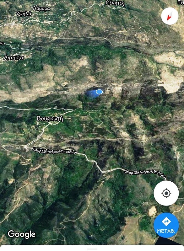 Το μπλε σημείο στον χάρτη δείχνει τα σημεία της εξέλιξης της φωτιάς στις 19:00 απόψε (φωτ. Εν Άνδρω)