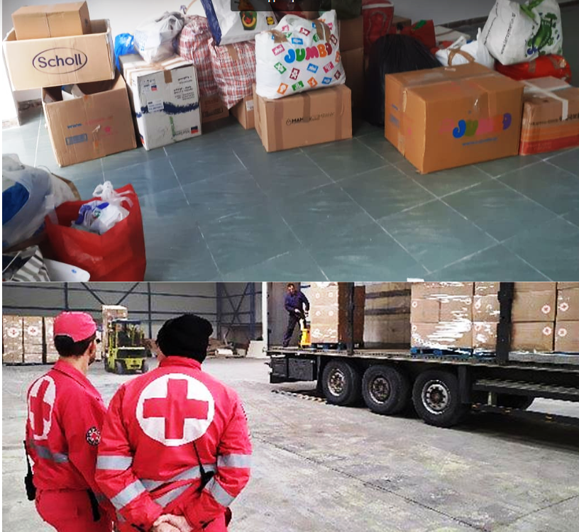 Πάνω ο χώρος γεμάτος πράγματα. Κάτω η μεταφορά στον Ερυθρό Σταυρό για αποστολή στην Αλβανία.