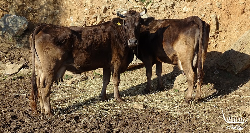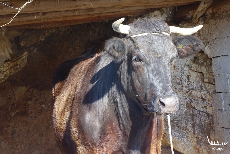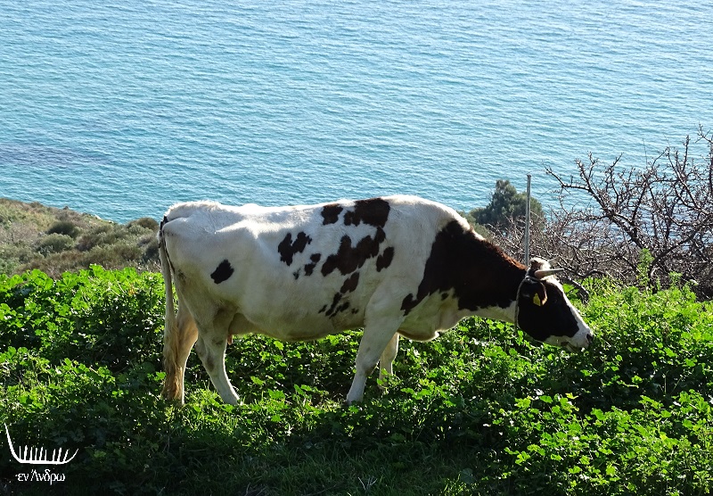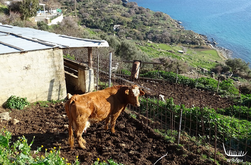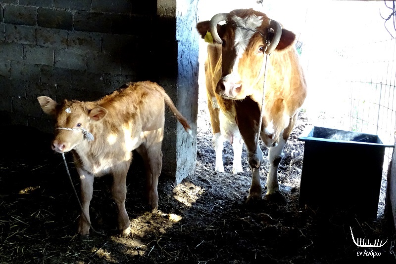 Με όλα αυτά κατά νου επισκεφθήκαμε μια από τις ηλιόλουστες χειμωνιάτικες μέρες το κτήμα του στην Παλαιόπολη όπου έχει τις 9 γελάδες του. Και τα μοσχαράκια τους. μπορεί το κτήμα να είναι σε αιμασιές, κατηφορικό, όμως η θέα του είναι πανοραμική. Δεν μπορείς να μην δεις πως οι ευτυχισμένες γελάδες βόσκουν σε ένα πανοραμικό περιβάλλον.