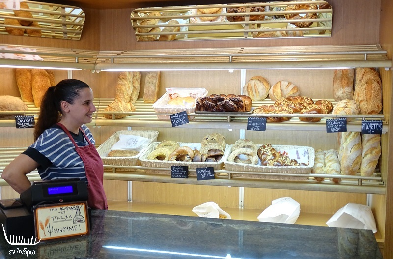Χαμογελαστή η όμορφη φουρνάρισσα δείχνει τα μισοάδεια ράφια της και σχολιάζει: "τα σήκωσαν όλα από το πρωί...