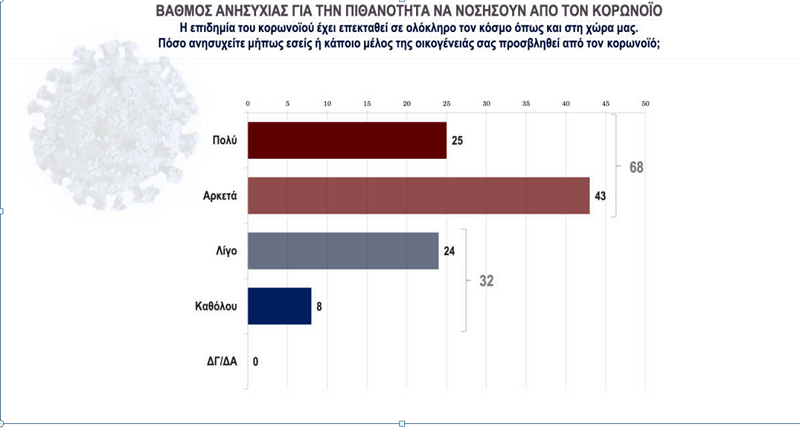 Οι πολίτες που συμμετείχαν στη δημοσκόπηση δηλώνει σε ποσοστό 68% ότι ανησυχούν πολύ (25%) ή αρκετά (43%) ότι θα νοσήσουν από τον κορονοϊό, ενώ το 32% απαντά λίγο (24%) ή καθόλου (8%).