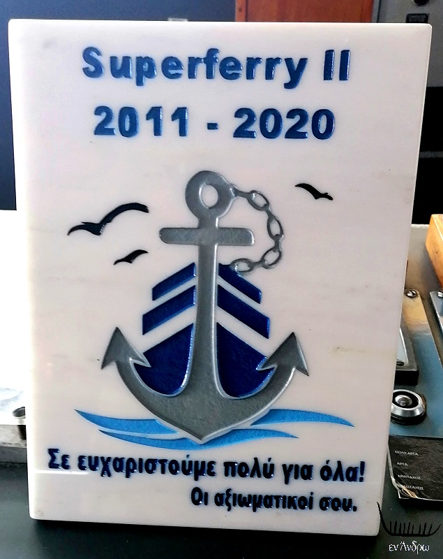 Μετά την Άνδρο, οι αξιωματικοί αποχαιρέτισαν τον αγαπητό τους πλοίαρχο και του παρέδωσαν, μια αναμνηστική πλακέτα, να του θυμίζει τα περίπου 10 χρόνια που πέρασαν μαζί μονιασμένοι, τρικυμίες και μπουνάτσες και όλο το πλήρωμα πέρασε από τη γέφυρα να του ευχηθεί καλή συνέχεια.
