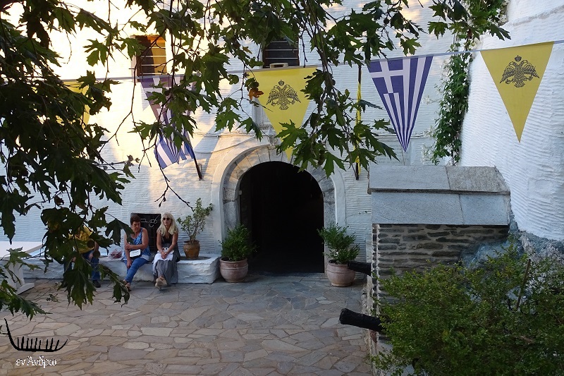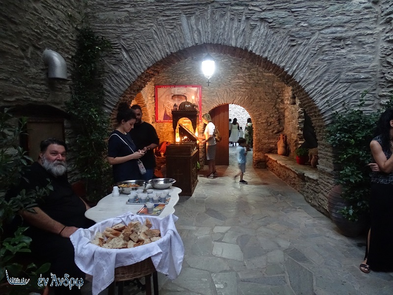 Και κάπου εκεί η πολιτογραφημένη εδώ και χρόνια ανδριώτισα Ελένη Μενεγάκη φτάνει στο φωτισμένο - και εορτάζον - μέσα στο σούρουπο μοναστήρι. Διακριτικά καιι από την πίσω πόρτα. Την υποδέχεται ο πατήρ Αέτιος. Βγαίνοντας από τον ναό δέχεται να φωτογραφηθεί για φίλους και κατοίκους με την μητέρα της και τον Αέτιο...