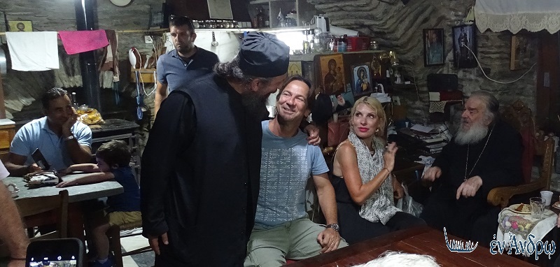 Αρκετός ο κόσμος για τα δεδομένα της δύσκολη εποχής στον εσπερινό της μεγάλης καλοκαιρινής γιορτής του Αγίου Παντελεήμονα. Προσεκτικά διατεταγμένος και σε κάποιες αποστάσεις. Δύσκολη περίοδος. Όμως και η στοργή κι αγάπη που περιβάλει η κοινωνία το μοναστήρι της Παναχράντου και του Αγίου Παντελεήμονα μεγάλη. Όπως μεγάλη και η στοργή με την οποία περιβάλουν Ανδριώτες και άνθρωποι από πολλά άλλα μέρη του κόσμου τον κοσμαγάπητο ηγούμενο Ευδόκιμο, που δικαίως θεωρείται ο "παππούς της Άνδρου"! Στον "παππού της Άνδρου" προσήλθε χτες μετά τον εσπερινό της μεγάλης γιορτής και η Ελένη Μενεγάκη. Αλλά ας πάρουμε τα πράγματα με την σειρά...