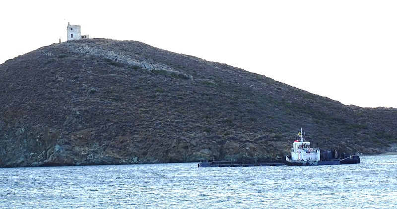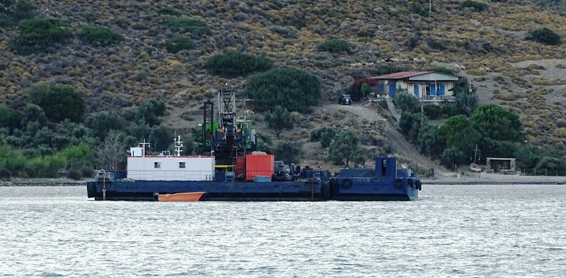 Και το πρώτο έργο άνω του ενός εκατομμυρίου ευρώ που εκτελείται. Η πλατφόρμα με τον γερανό που κάνει την εκβάθυνση του λιμανιού. Ξεκίνησε τον Αύγουστο. Θα διαρκέσει μήνες.