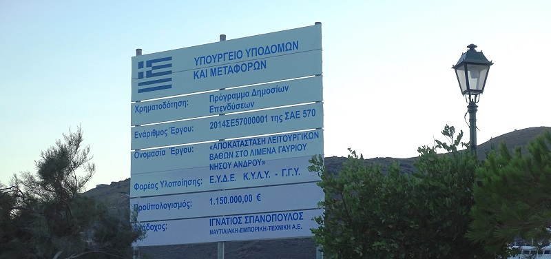 Πόσα χρόνια είχαν οι Γαυριώτες και οι Ανδριώτες να δουν ταμπέλα εκτελούμενου έργου από το ΕΣΠΑ ή το Πρόγραμμα Δημοσίων Επενδύσεων στην Άνδρο; Μην ψάχνετε από τον Βιολογικό της Χώρας και τον πεζόδρομο του Νειμποριού. 8 και 6 χρόνια πριν. Καλορίζικη η πρώτη ταμπέλα μετά από τόσα χρόνια.