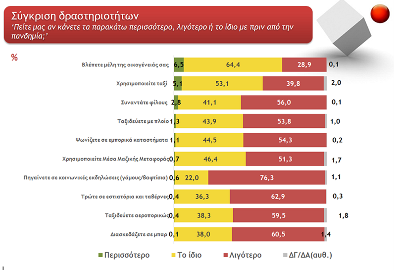 Σύμφωνα με τα στοιχεία  της έρευνας το 76,3% δηλώνουν ότι πηγαίνουν σε λιγότερες κοινωνικές εκδηλώσεις (γάμους, βαφτίσια) από ότι πριν από την πανδημία και το 62,9% ότι τρώνε λιγότερο συχνά σε εστιατόρια και ταβέρνες. Το 73,9% παραδέχονται ότι η ζωή τους έχει αλλάξει “πάρα πολύ” ή “αρκετά”. Δεν υπάρχει πληθυσμιακή ομάδα, ηλικιακό γκρουπ, κοινωνική τάξη ή ιδεολογικό γκρουπ που να δηλώνει κατά πλειοψηφία ότι δεν έχει αλλάξει η ζωή τους.