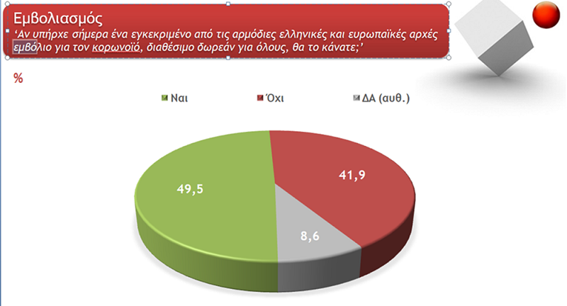 Απίστευτα - αλλά αναμενόμενα - ευρήματα ανέδειξε η ερεύνα της διαΝΕΟσις σε συνεργασία με τη Metron Analysis, που αποκαλύπτει πως η Covid-19 έχει μεταμορφώσει τη ζωή μας τους τελευταίους μήνες. Το πιο εντυπωσιακό είναι ότι μόνο οι μισοί Έλληνες -ποσοστό 49,5% - δηλώνουν ότι αν υπήρχε σήμερα ένα εγκεκριμένο από τις αρμόδιες ελληνικές και ευρωπαϊκές αρχές, διαθέσιμο δωρεάν για όλους   θα το έκαναν, ενώ το 41,9% δηλώνει πως όχι, ενώ το 60,6% δηλώνουν ότι στην καθημερινότητά τους συναντιούνται και συνομιλούν με λιγότερους ανθρώπους από ότι θα έκαναν αν δεν υπήρχε πανδημία και βρίσκονται στα όρια της κοινωνικής απομόνωσης!