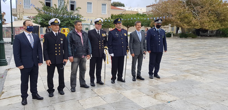Στην Χώρα η γιορτή ήταν ακόμα πιο μοναχική. Στην κεντρική πλατεία Γηροκομείου ήταν δεν ήταν 100 άνθρωποι. Οι επίσημοι, οι πολιτικές και στρατιωτικές αρχές, οι σημαιοφόροι μαθητές με τις σημαίες και λίγος κόσμος. Πρώτη φορά γιορτάζεται εθνική γιορτή στην Άνδρο σε άδεια πλατεία. Κορονοϊός γαρ. Στη φωτογραφία οι αρχές και τα σώματα ασφαλείας μπροστά στο ηρώων όπου κατέθεσαν στεφάνια.