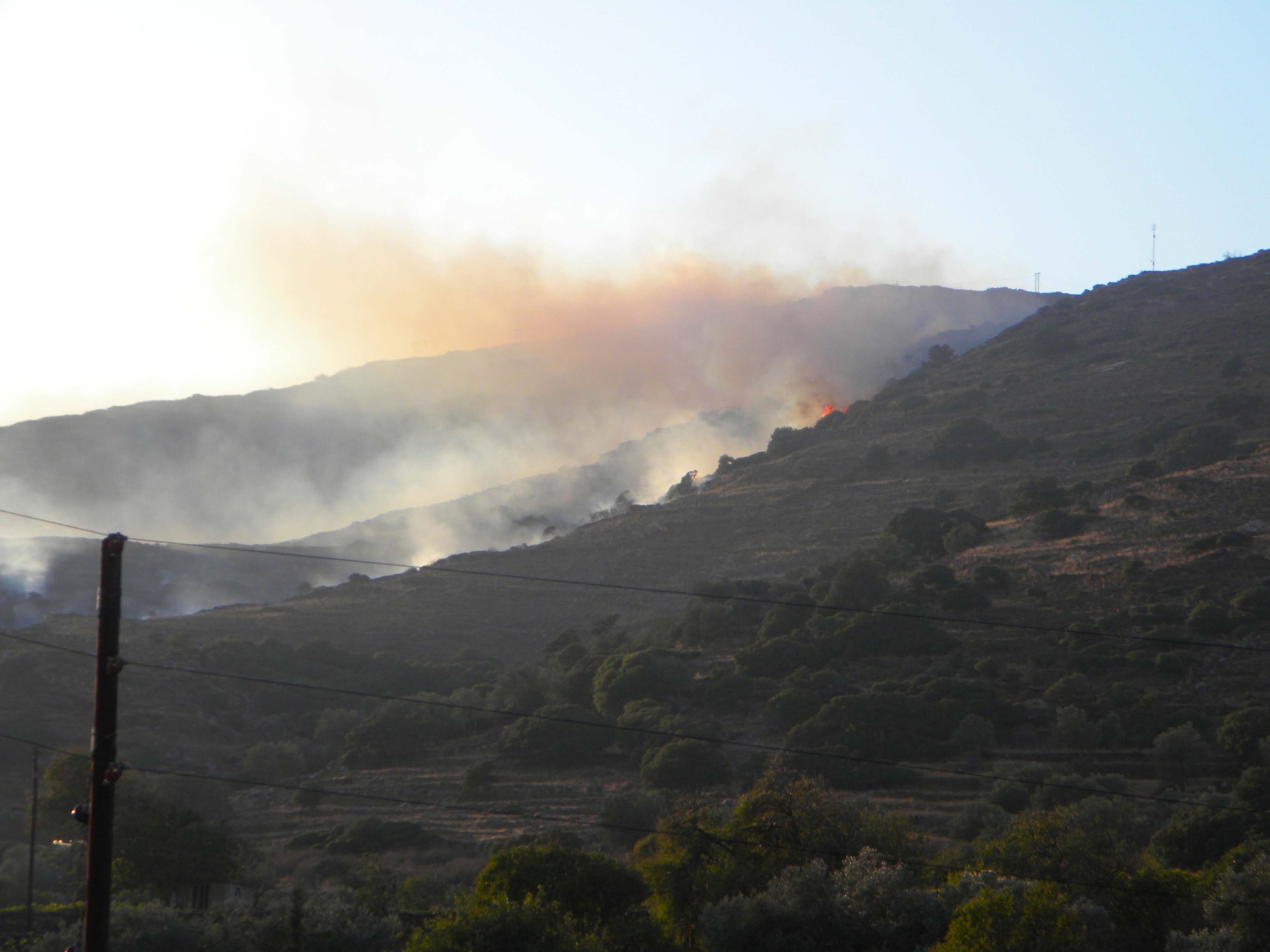 Η φωτιά έχει πλέον ξεφύγει. Αυτή τη στιγμή καταφθάνουν οχήματα της πυροσβεστικής (από αυτά που περιφρουρούσαν για τυχόν αναζωπυρώσεις στο Συνετί). Αυτή τη στιγμή γίνεται συγχρόνως μια πρώτη εκτίμηση μεταξύ του προϊσταμένου Άνδρου και αξιωματικών που ήρθαν χτες. Ίσως κληθούν στα επόμενα λεπτά εναέριες δυνάμεις. Η φωτιά κινείται προς ένα εκκλησάκι της περιοχής (με επιφύλαξη ίσως λέγεται Αγία Μαρίνα).