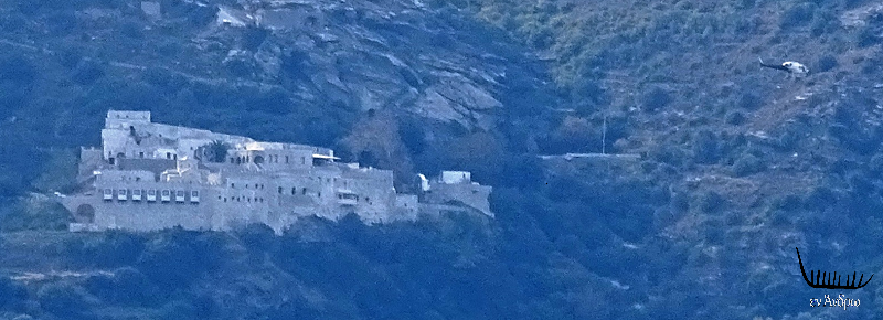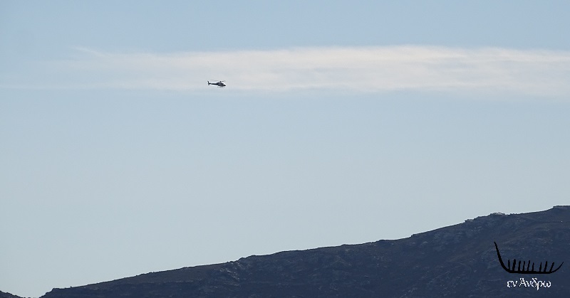 Μια ακόμα εντυπωσιακή φωτογραφία της πλαγιάς των Γερακώνων και της Μονής Παναχράντου. Το μπλε-άσπρο ελικόπτερο μεταφέρει τον ασθενή εξ Άνδρου προς Αθήνα.