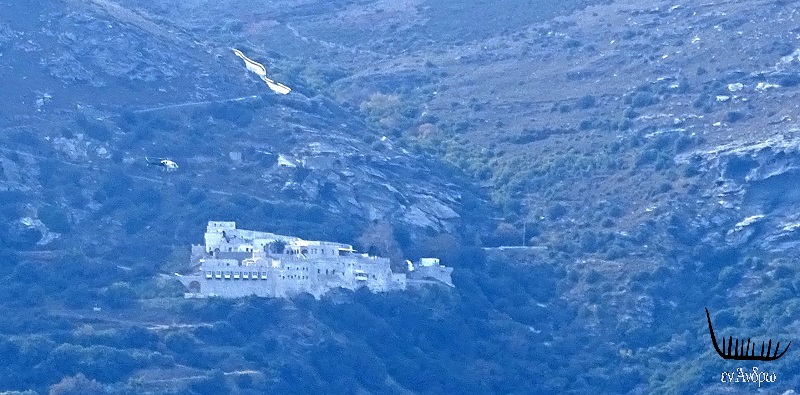 Μια θεαματική φωτογραφία. Το ελικόπτερο περνά μπροστά από την Μονή Παναχράντου της Άνδρου.