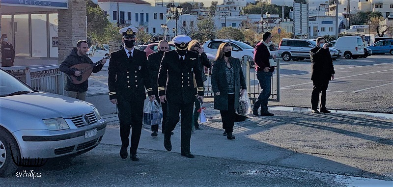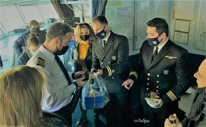 Ανέβηκαν στο πλοίο όλοι μαζί και αντάλλαξαν δώρα με τον καπετάνιο και τους αξιωματικούς. Να σημειώσουμε πως ο καπετάνιος του πλοίου Caldera Vista της Seajets είναι ο Μενέλαος Διαπούλης από τις Στενιές της Άνδρου!!!