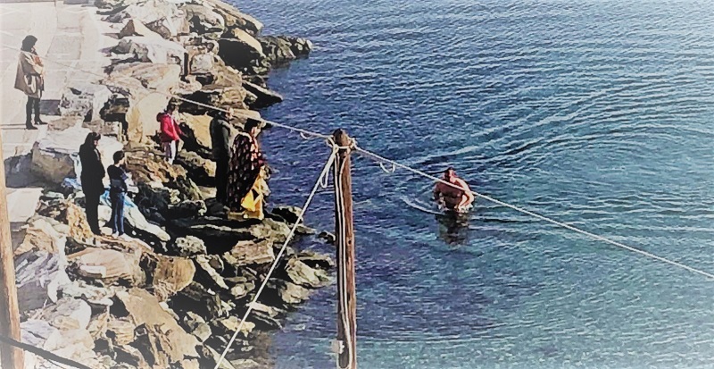 Ο παπα-Μιχάλης της Θεοσκεπάστου τέλεσε την λειτουργία και τον αγιασμό εντός της άδειας εκκλησίας, αλλά έριξε και τον σταυρό στη θάλασσα για το καλό. Μόνο που δεν ήταν στην Αγία Θαλασσινή όπως κάθε χρόνο, αλλά στο αλμυρό Παραπόρτι. Πέταξε τον σταυρό στη θάλασσα αγιάζοντας - έστω και με περιορισμένο πλήρωμα πιστών - την θάλασσα! Νησί είμαστε θα άφηνε ο παπα-Μιχάλης τη θάλασσα χωρίς να την... αγιάσει;;; Υπήρξαν μάλιστα και γενναίος κολυμβητής που έκανε την απόσταση για να τον βρει μιας και ο παπα-Μιχάλης πέταξε μακριά τον σταυρό δίνοντας διάρκεια στο σύντομο αγιασμό...