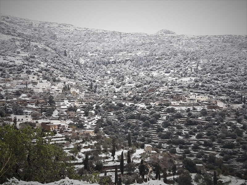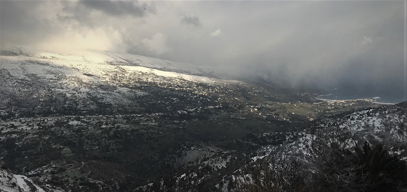 Οι Γερακώνες που κοιτούν βόρειο-ανατολικά χιονισμένοι. Αλλά όχι βαριά. Κυρίως στα ψηλά. Στην κορυφογραμή. Το χιόνι πέρασε την Πανάχραντο κι έφτασε στα Φάλικα.