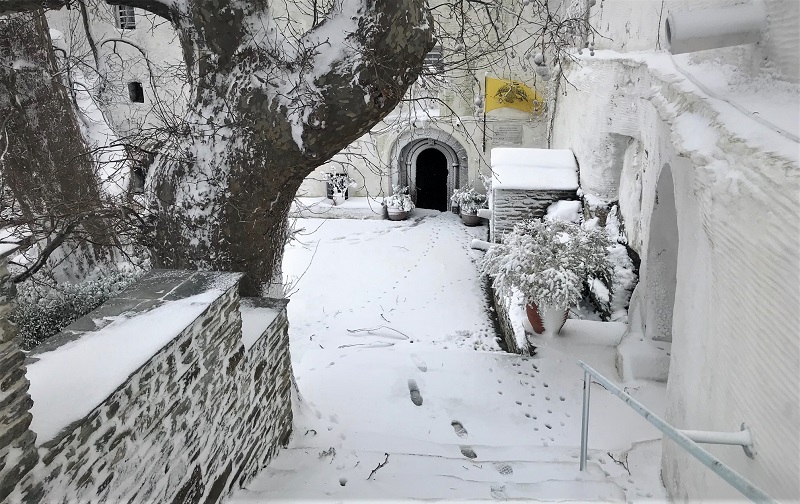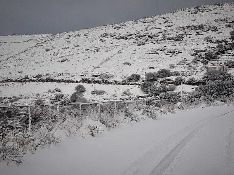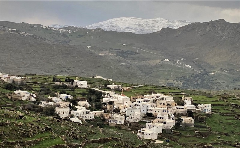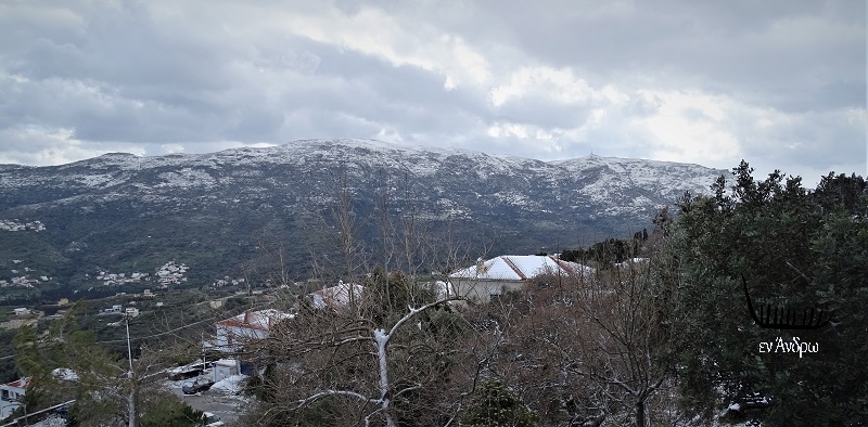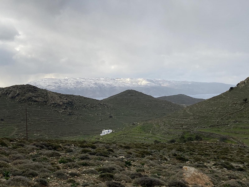 Συνεργάτης από την Τήνο ταξίδεψε μέχρι την περιοχή του Πύργου της Τήνου μόνο και μόνο για να δει κανονικό χιόνι επειδή στην Τήνο όλη μέρα είχε πέσει πολύ λιγότερο. Φτάνοντας στα ορεινά της περιοχής του Πύργου άρχισε τα επιφωνήματα και μας πήρε τηλέφωνο. Του ζητήσαμε μερικές φωτογραφίες για το πως φαίνονταν σήμερα τα χιονισμένα βουνά του Στενού και η Άνδρος από την Τήνο.