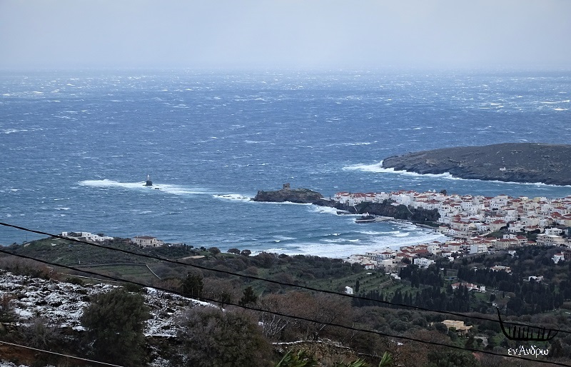Από τις 14:00 το χιόνι κόπασε στην Άνδρο. Ιδίως στις κεντρικές και νοτιοανατολικές περιοχές που δέχτηκαν το κύμα της καταιγίδας. Ο ήλιος - ένας ήλιος με δόντια - έκανε πάλι την εμφάνιση του. Ο αέρας στη στεριά σα να κόπασε. Στη θάλασσα όμως το κύμα αφρισμένο όσο φτάνει το μάτι. "Ω αμάραντο πέλαγο" που έγραψε ο Ελύτης. Αμάραντο και αφρισμένο πέλαγο, θα γράφαμε εμείς σήμερα.