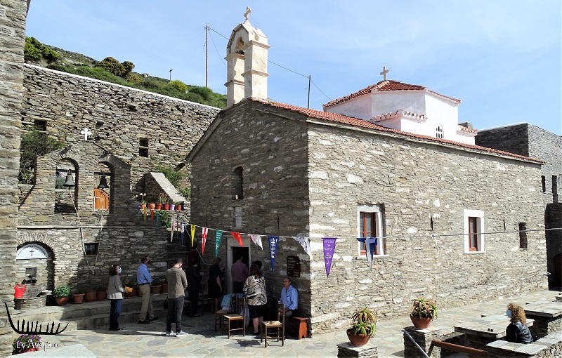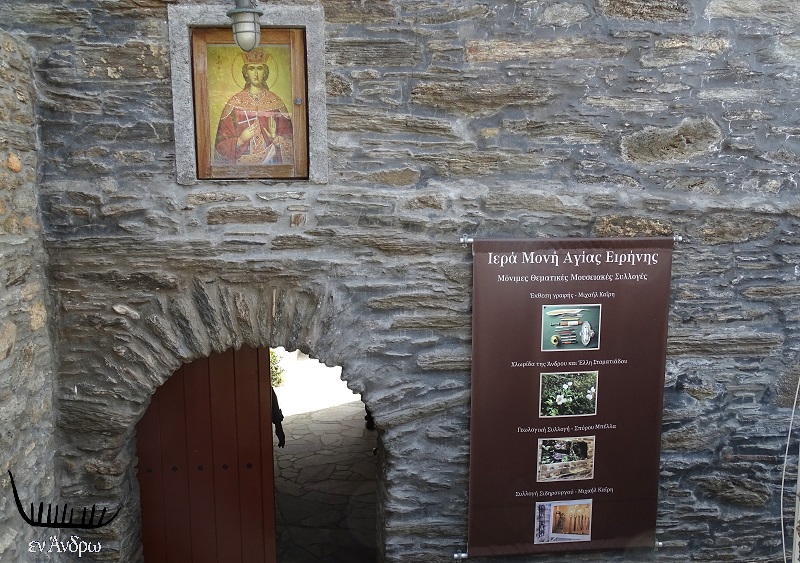 Πρωινό Τετάρτης, 6 Μαΐου 2021. Ξεκινήσαμε για το μοναστήρι/μουσείο της Αγίας Ειρήνης στ' Αποίκια, που γιόρταζε. Το κάποτε παλαιοημερολογίτικο μοναστήρι της Άνδρου έχει μια ιστορία που ξεκινά γύρω στο 1780 και σβήνει πριν αρκετές δεκαετίες όταν εγκαταλείφθηκε πλήρως κι έγινε στάβλος για ζώα. Μόνο ο ναός απέμεινε να θυμίζει κάτι από την προηγούμενη λειτουργία του. Το μοναστήρι παρέμεινε κλειστό ή στάβλος για ζώα μέχρι το 2007 όταν αγοράστηκε ως οίκημα από τον παλιό καπετάνιο και σήμερα πλοιοκτήτη Λευτέρη Πολέμη και αποκατέστησε το ναό της Αγίας Ειρήνης...