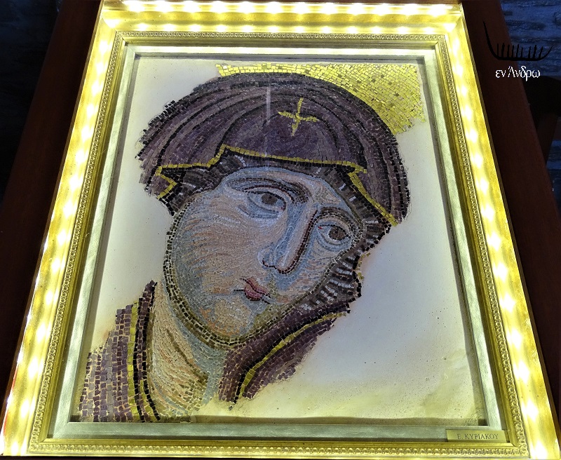 Κλείνοντας αυτή την σύντομη περιδιάβαση στη γιορτή και στο ιστορικό του μοναστηριού της Αγίας Ειρήνης δύο λόγια για ένα εξαιρετικό ψηφιδωτό που μας τράβηξε την προσοχή στη διάρκεια της λειτουργίας και το φωτογραφήσαμε προσεκτικά. Η αδελφή του Λευτέρη, λίγο αργότερα, μας εξηγησε: "Είναι ψηφιδωτό αντίγραφο της Παναγίας, από την Αγία Σοφία στην Κωνσταντινούπολη. Από αυτά που σκέπασε ο Ερντογάν. Το έκανε η καλλιτέχνης Ελένη Κυριάκου σε ψηφιδωτό. Και το πρόσφερε στο μοναστήρι..."