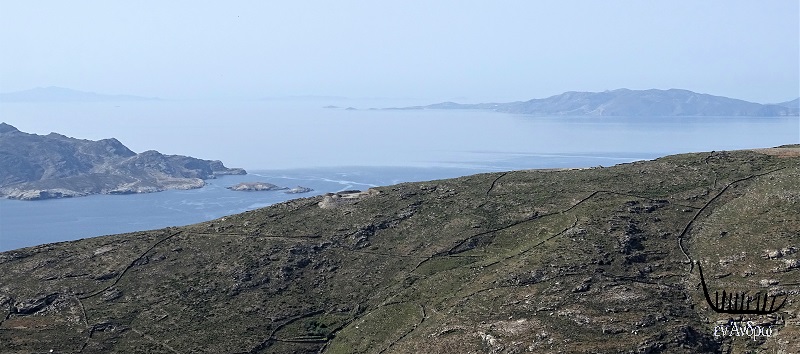 Αυτά βλέπεις όσο διατρέχεις την κορυφή της Ράχης από την μεριά του Όρμου. Όμως από ένα σημείο και μετά ο δρόμος χωρίζει στα δύο. Δεξιά συνεχίζει ευθεία για τις Κρεμμύδες. Αριστερά καβαλάει την Ράχη και βλέπεις τις... Κρεμμύδες! Αν σηκώσεις τα μάτια και κοιτάξεις νότια πίσω από την Τήνο που είναι απέναντι ξεχωρίζει αχνά και η Μύκονος!...